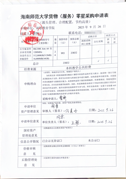 初等教育学院曹野老师购置行空板套件多种常用模块套件及主控板套件的公示